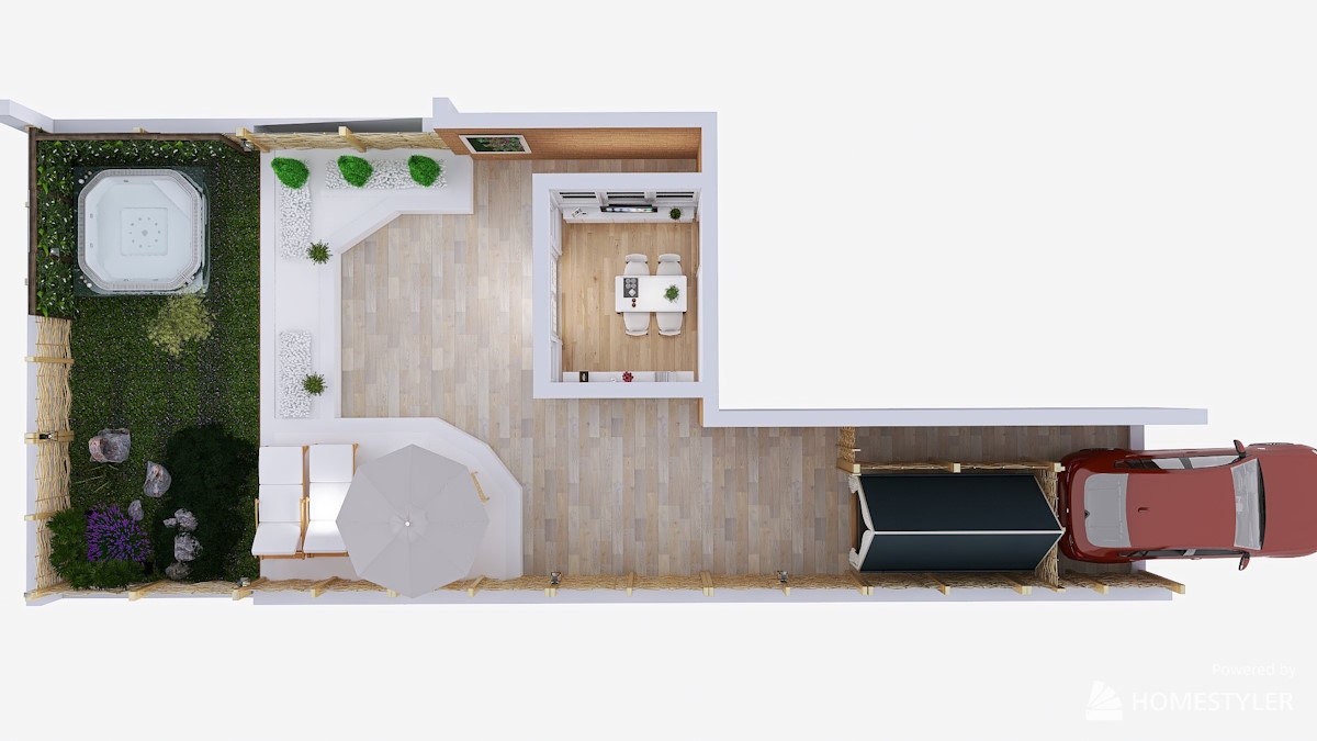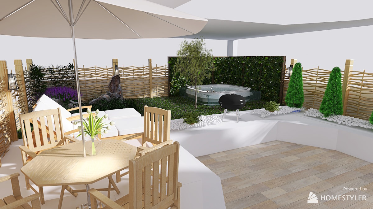 For a backyard remodel aimed at creating a versatile outdoor haven, envision a spacious area designed for relaxation and entertainment, featuring dedicated spaces for sitting, barbecuing, and enjoying a hot tub, as well as room for playing and a charming gazebo for little ones. All nestled among lush greenery, bathed in sunlight to enhance the inviting atmosphere.